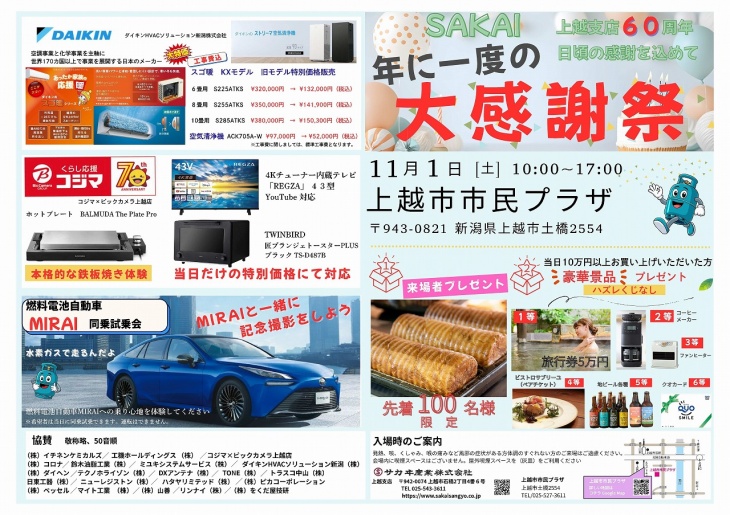 11月1日(土)10時~17時、上越市市民プラザにて『SAKAI 大感謝祭』を開催します。