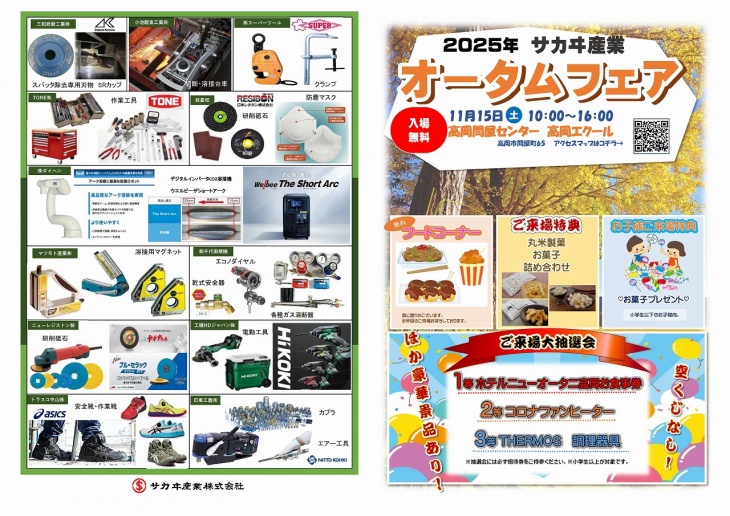 11月15日(土)10時~16時、高岡市の高岡問屋センター 高岡エクールにて『2025年サカヰ産業 オータムフェア(呉西エリア)』を開催します。